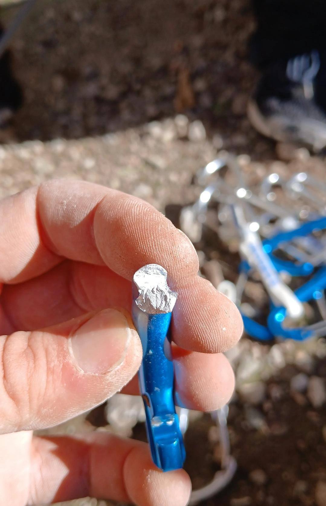 Aujourd'hui nous les avons inaugurée. Je me suis engagée dans une voie assez difficile, et lors d’un petit plomb [30 cm au dessus du point] la dégaine du dessous a littéralement pétée. Toutes les dégaines étaient à l’endroit et du bon côté par rapport au boulon. J’ai pris un plomb qui m’a redescendu violemment au 1 ier point [lors de la fracture de la degaine].